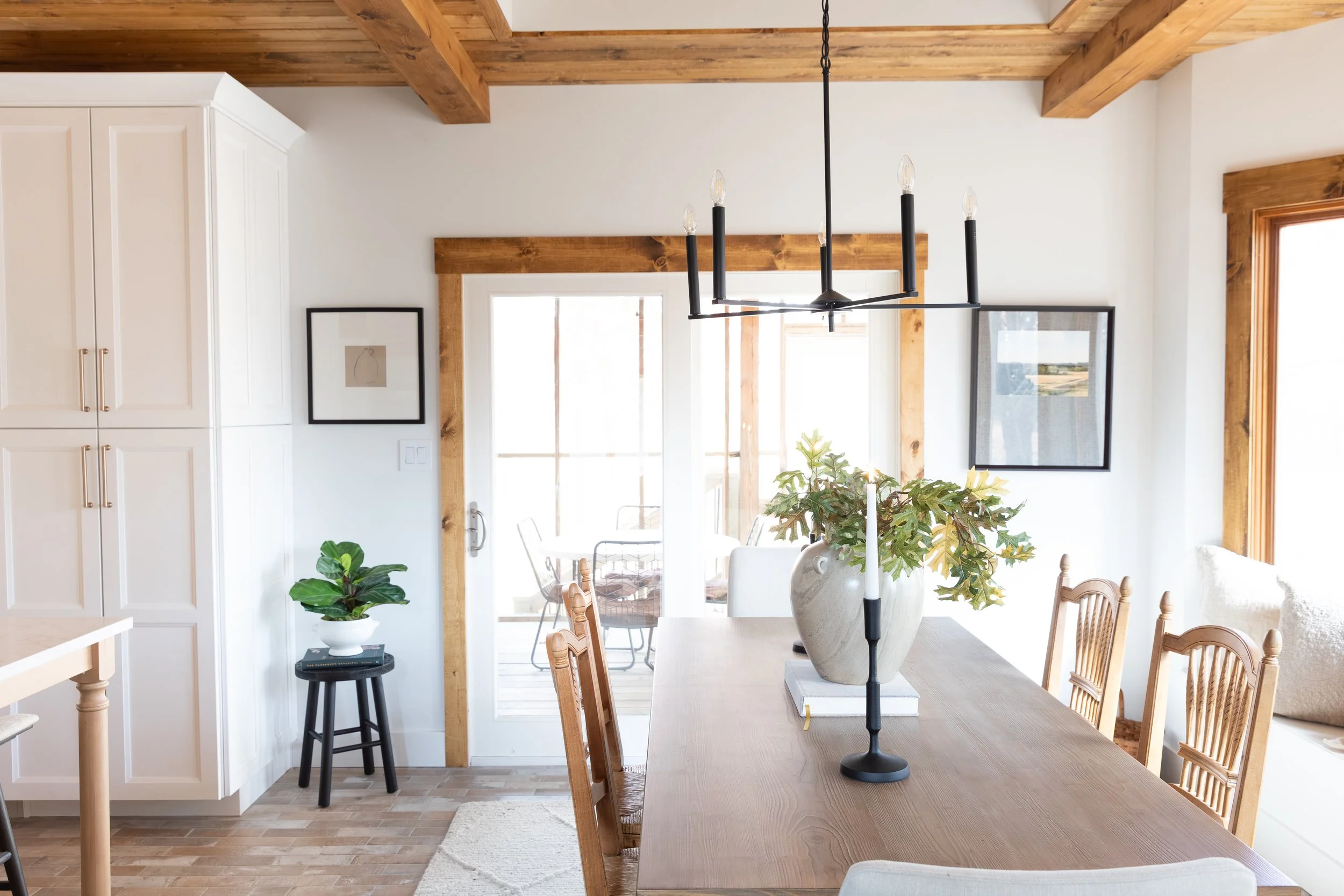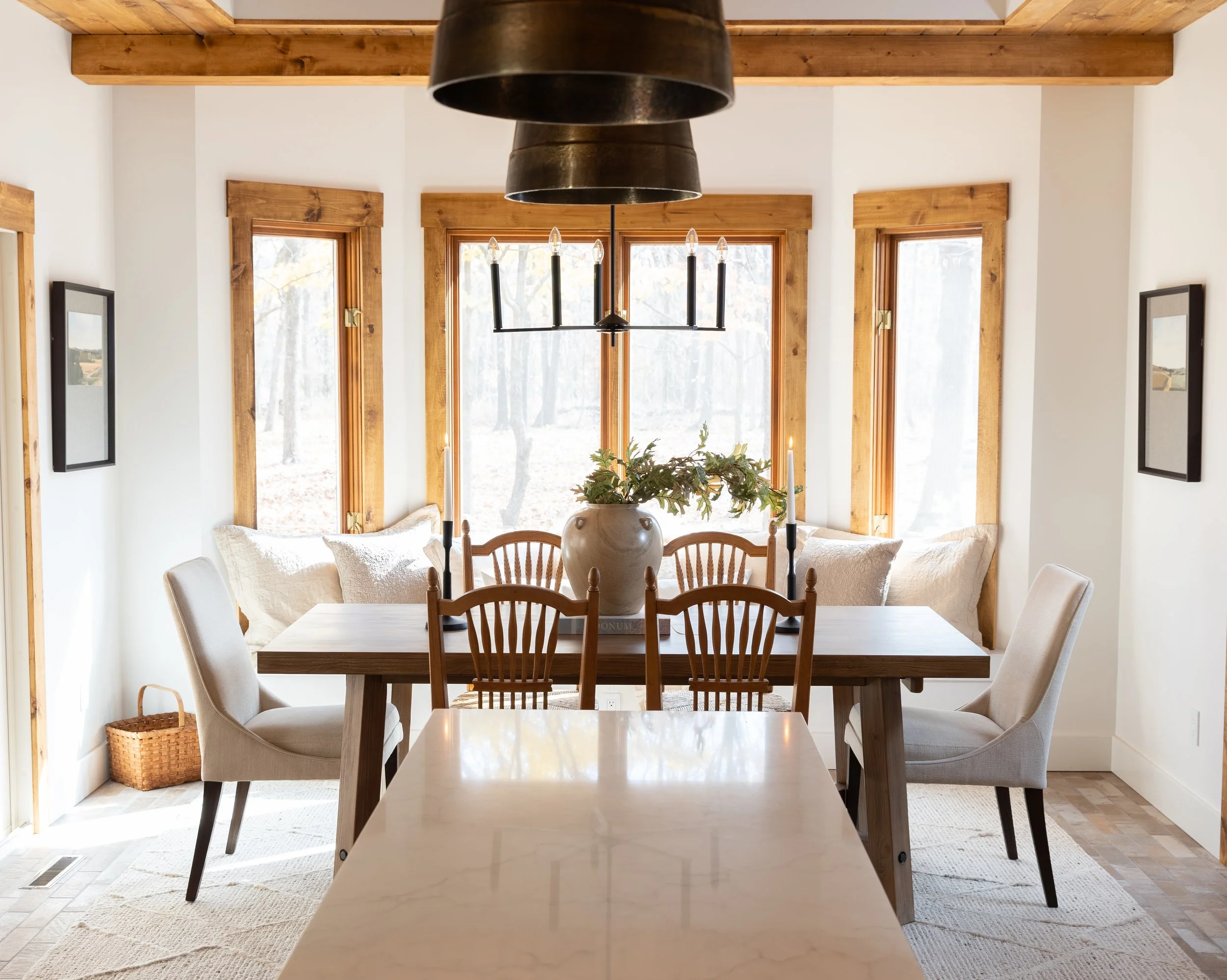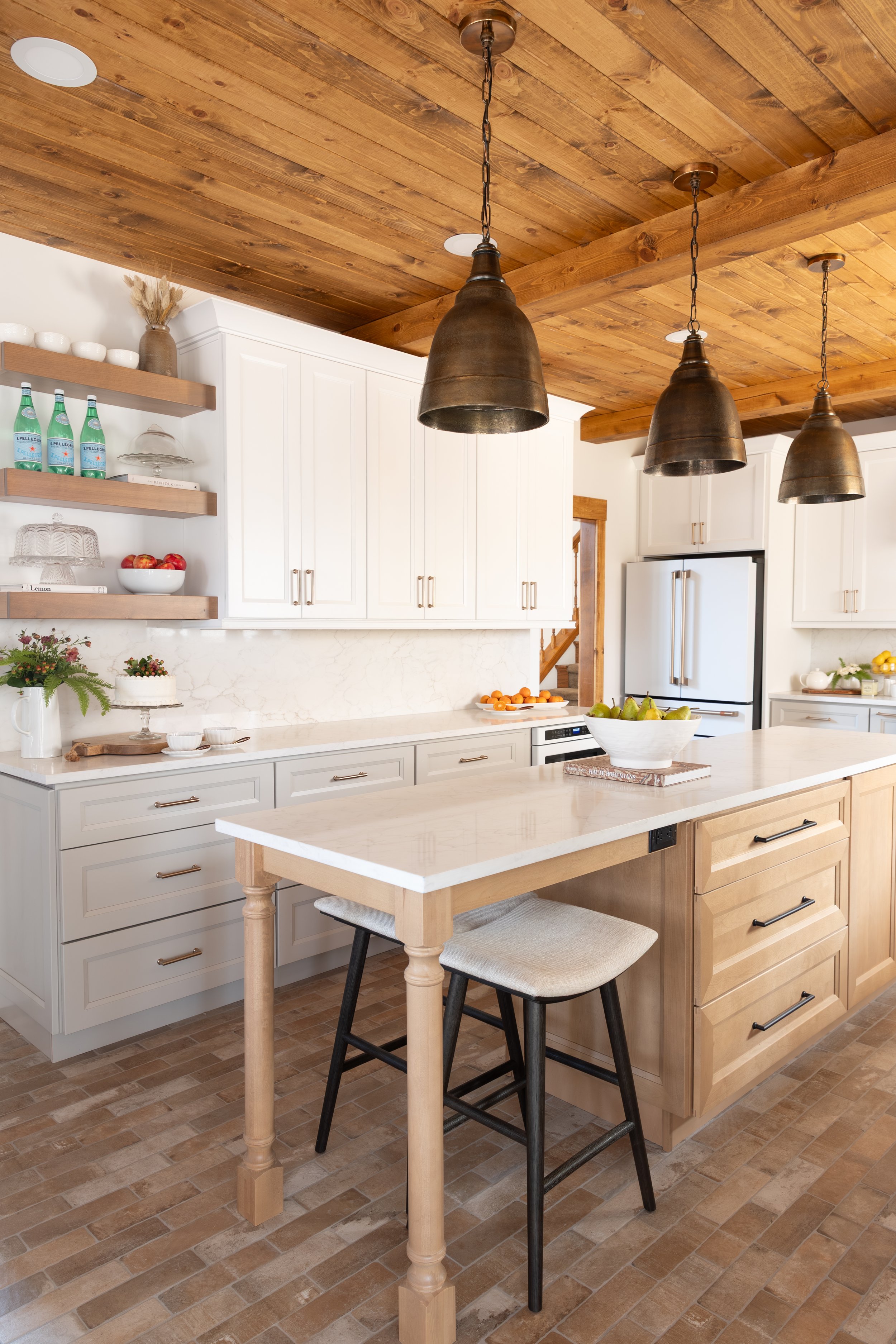 Nestled in a serene wooded landscape, we reimagined this home’s interior to reflect the natural beauty just beyond its windows. A wooden ceiling with sturdy beams, a brick tile floor, and white oak cabinetry were used to create a seamless connection between indoors and out.