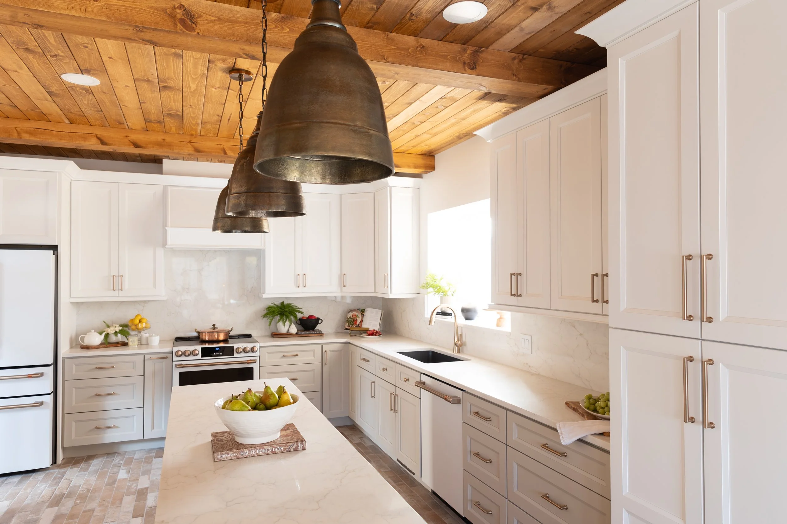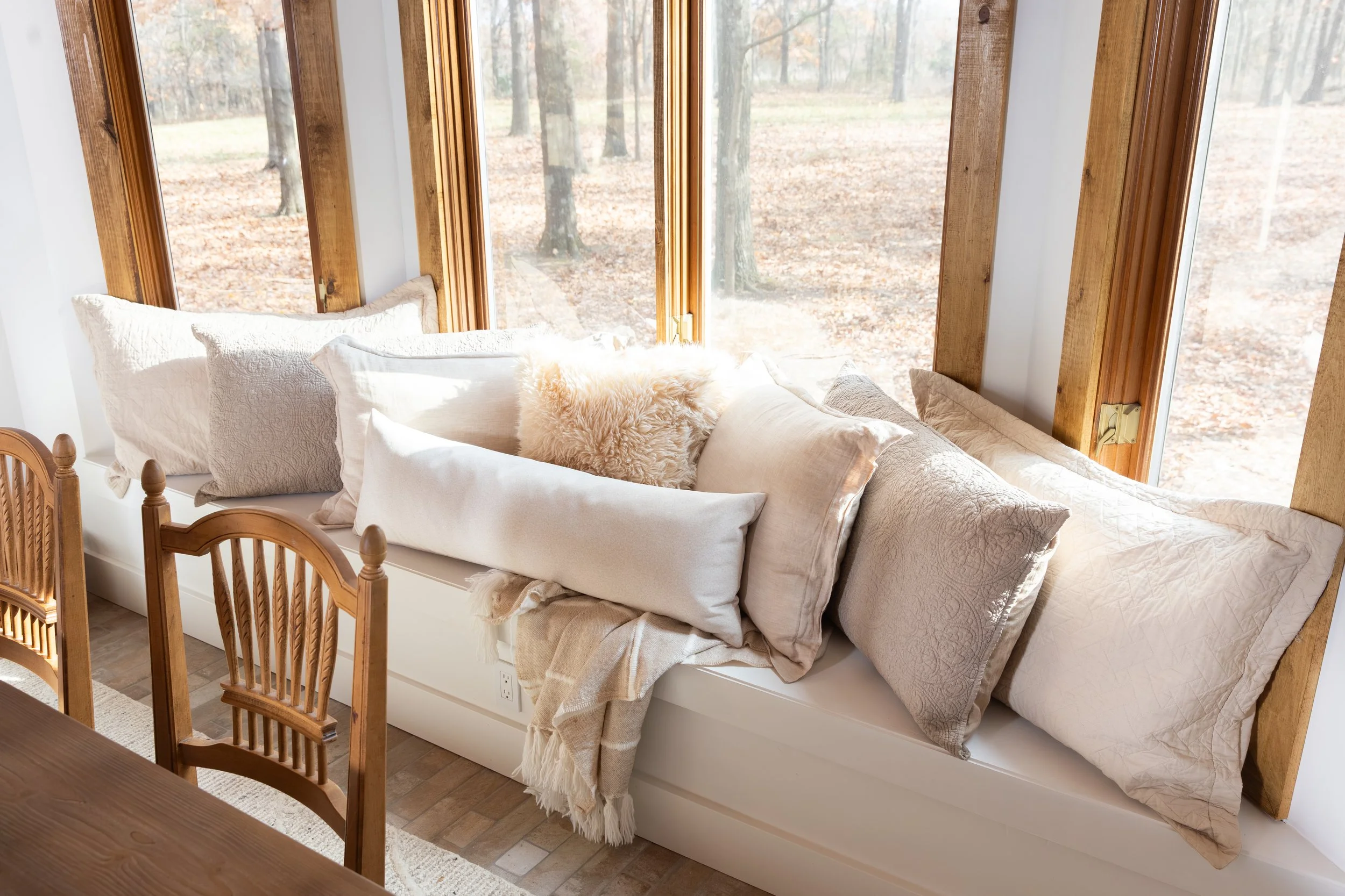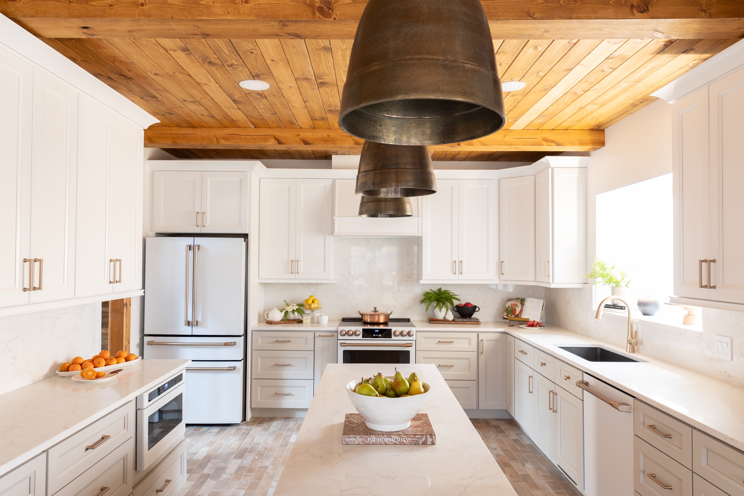 Nestled in a serene wooded landscape, we reimagined this home’s interior to reflect the natural beauty just beyond its windows. A wooden ceiling with sturdy beams, a brick tile floor, and white oak cabinetry were used to create a seamless connection between indoors and out.